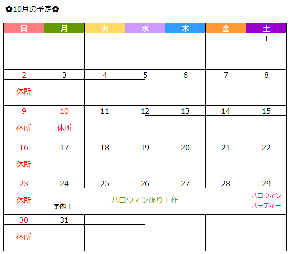 10月の予定のお知らせ